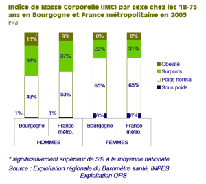 à présenter un surpoids et/ou une obésité (51 %) que les femmes (30%) en Bourgogne comme en France. Par ailleurs, les hommes bourguignons apparaissent davantage obèses que la moyenne des Français (15 % versus 9 %).